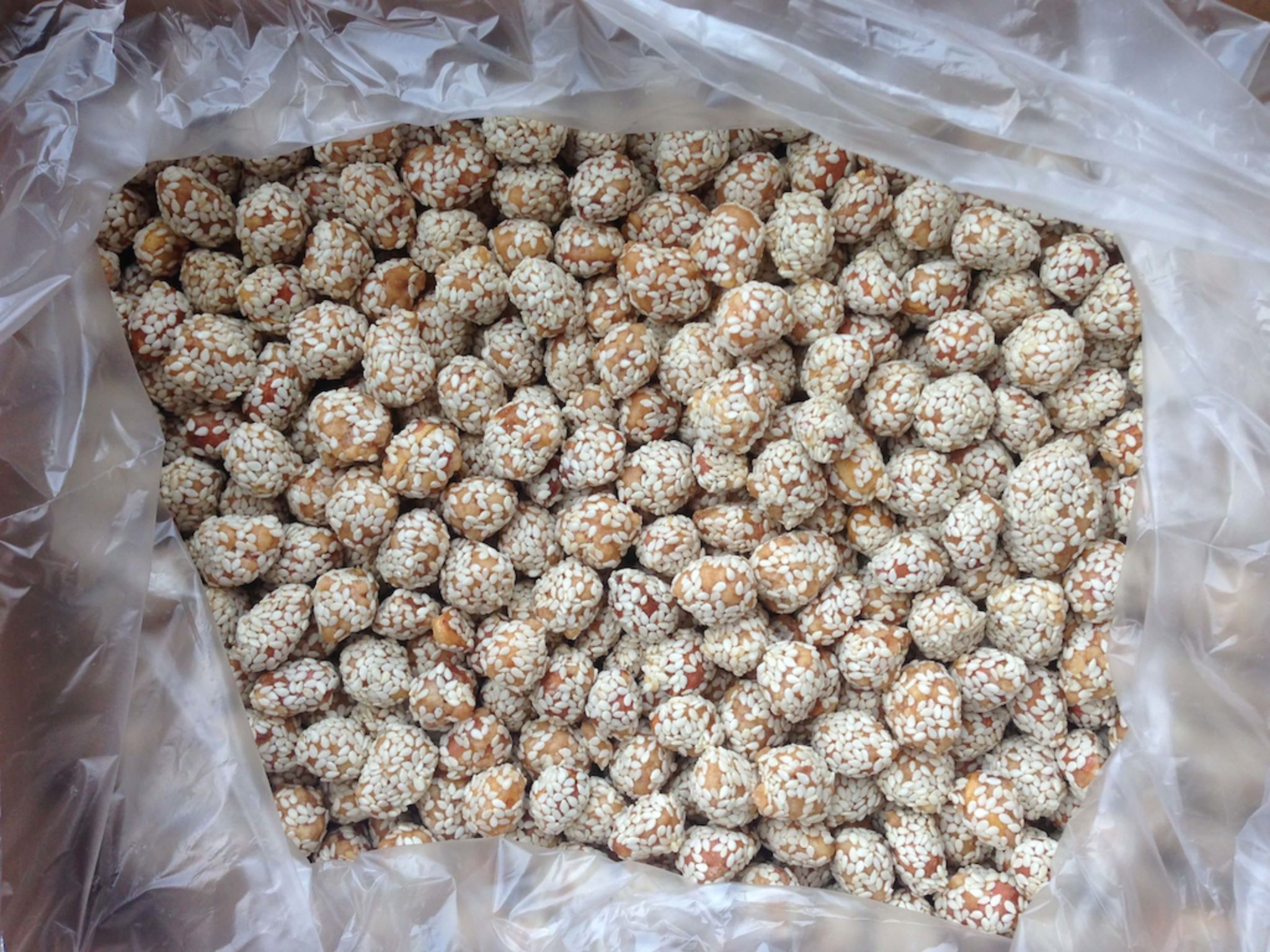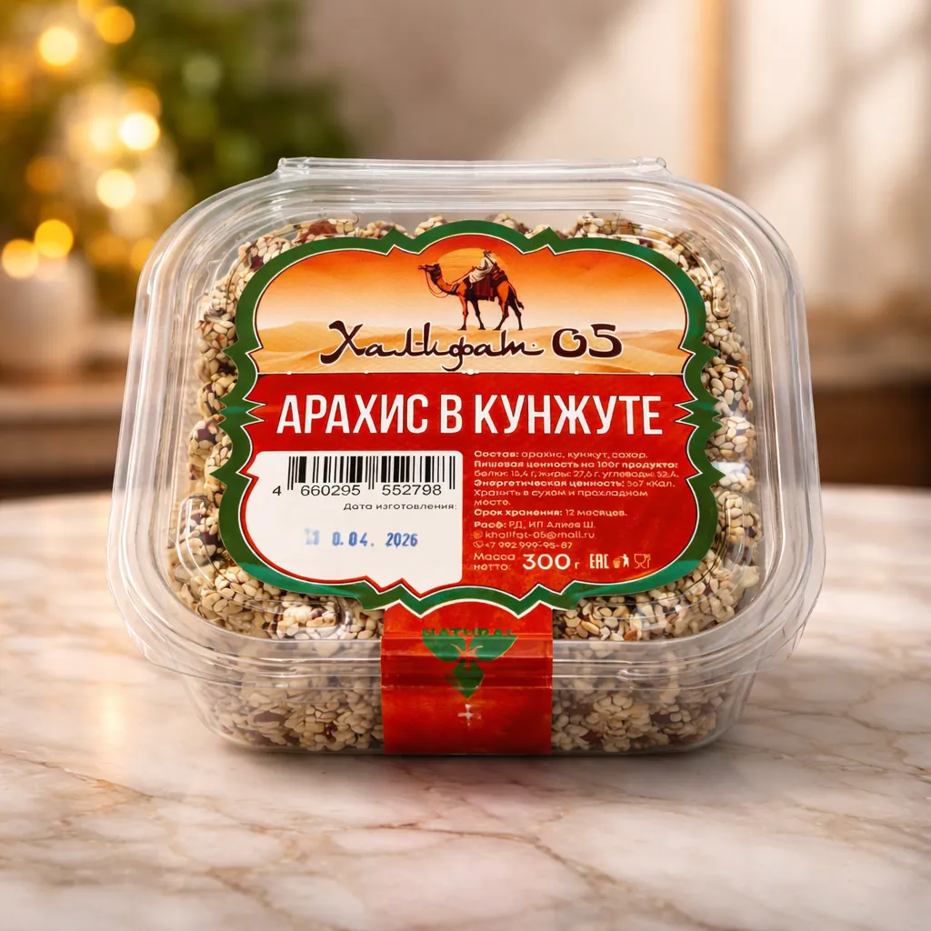 Обжаренные ядра арахиса, покрытые сладкой карамельно‑сахарной или медовой глазурью и щедро обвалянные в семенах кунжута. Орехи получаются хрустящими, с выраженным ореховым вкусом и лёгкими восточными нотками