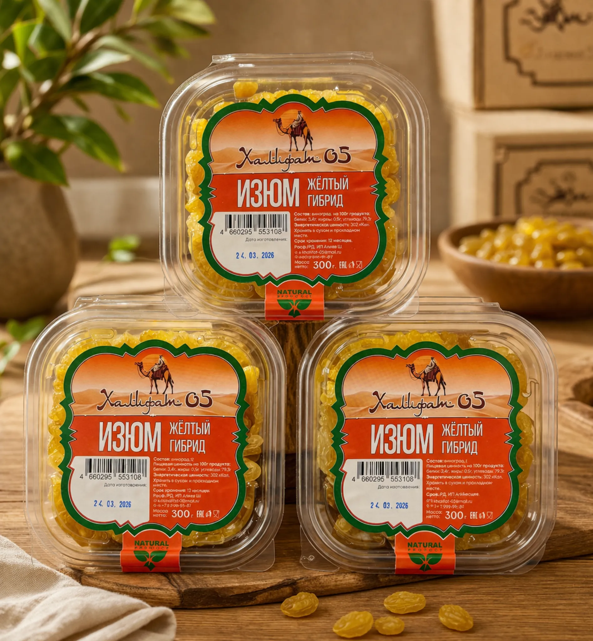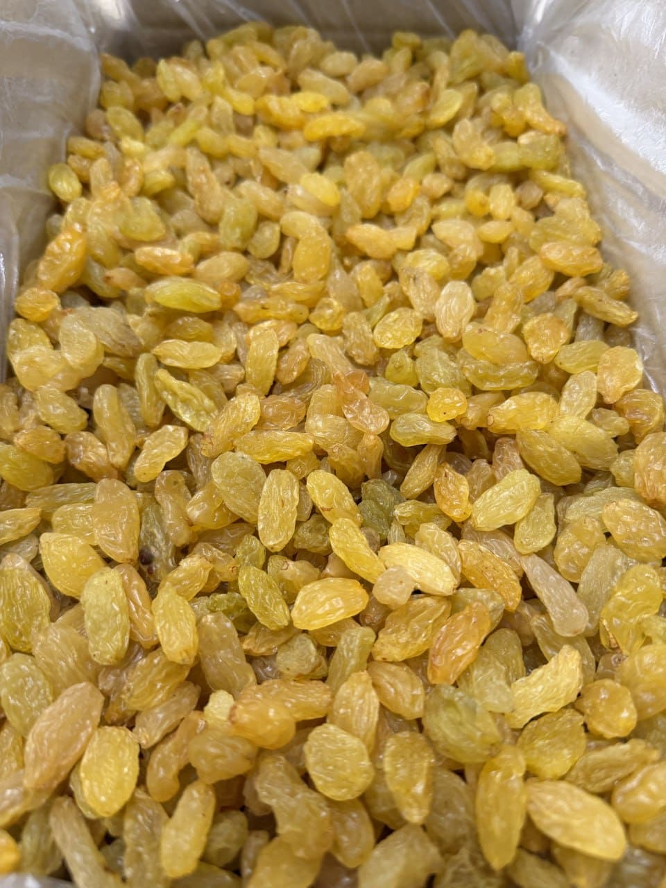 Отборный светло‑золотистый изюм без косточек, полученный из сладких сортов винограда и отличающийся крупными, мясистыми ягодами и насыщенным вкусом с лёгкой терпкостью