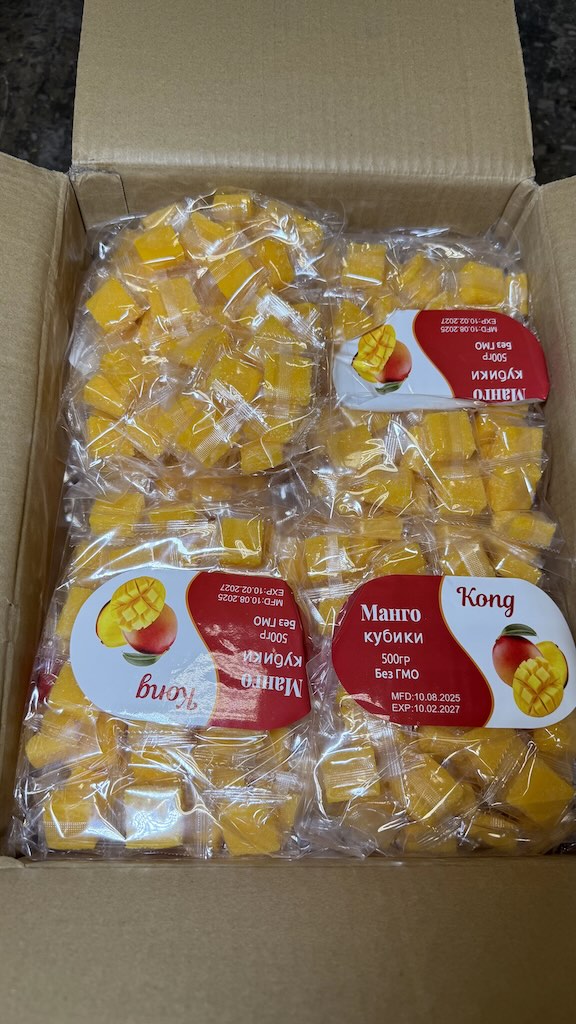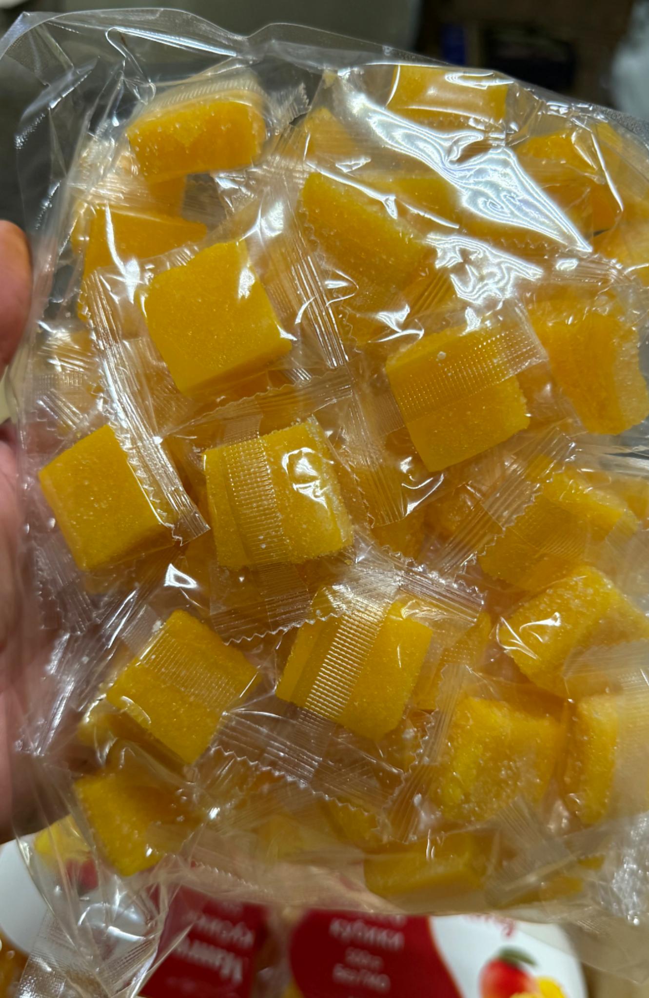 Жевательные фруктовые конфеты в форме небольших кубиков с ярким вкусом спелого манго и сладкой сахарной посыпкой