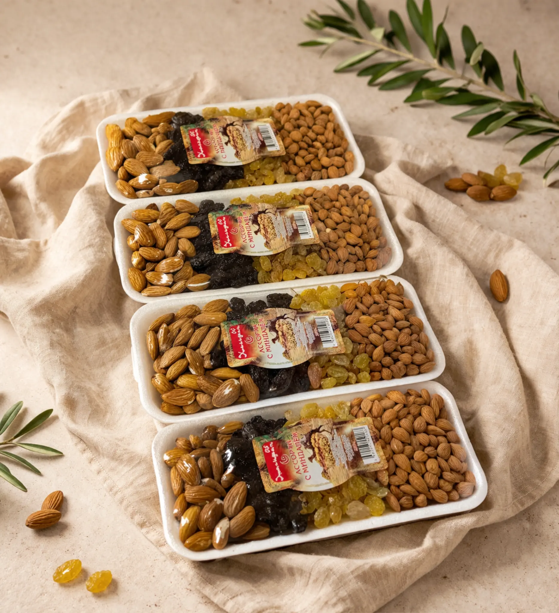 Изысканная смесь отборного миндаля и дополнений (орехов, сухофруктов или драже), созданная для эффектной подачи к чаю и кофе. Миндаль даёт насыщенный ореховый вкус и приятный хруст, а дополнительные ингредиенты добавляют десертные ноты и делают набор более разнообразным и ярким. Такой продукт подходит для повседневных перекусов, сервировки чайного стола и оформления подарочных боксов