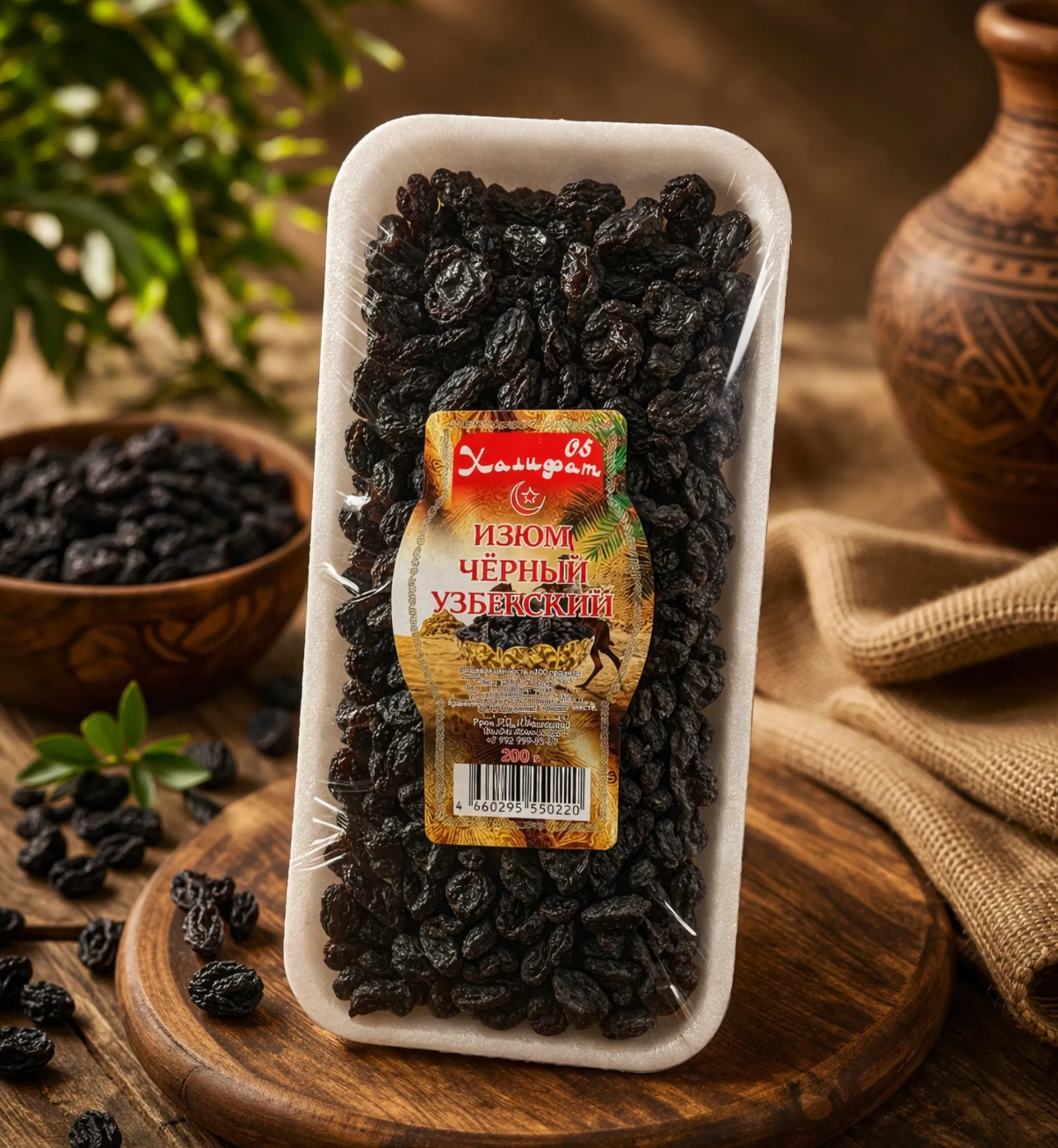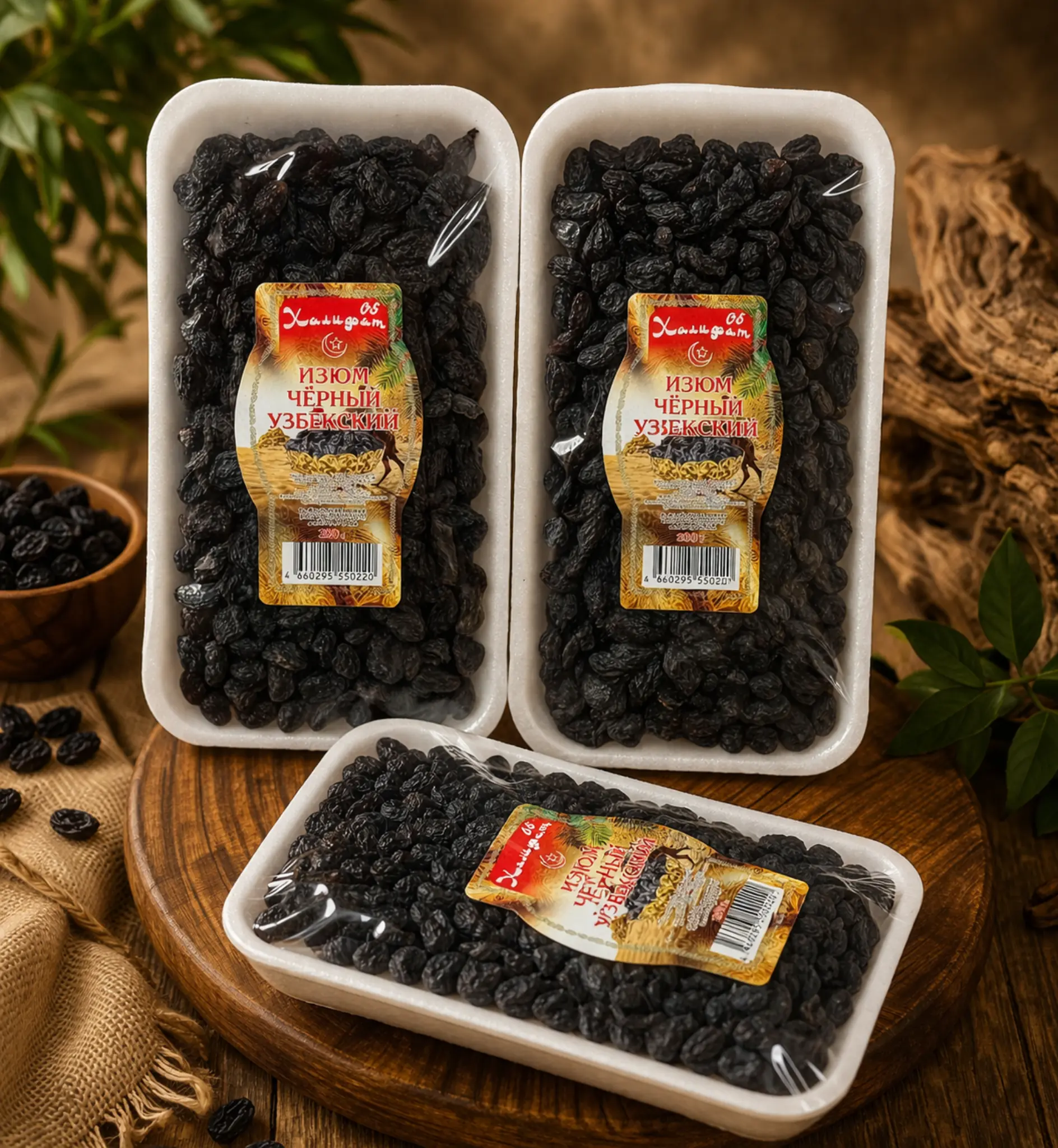 Отборные сушеные ягоды темного винограда из Узбекистана, отличающиеся насыщенным вкусом, синевато‑черным цветом и высокой естественной сладостью