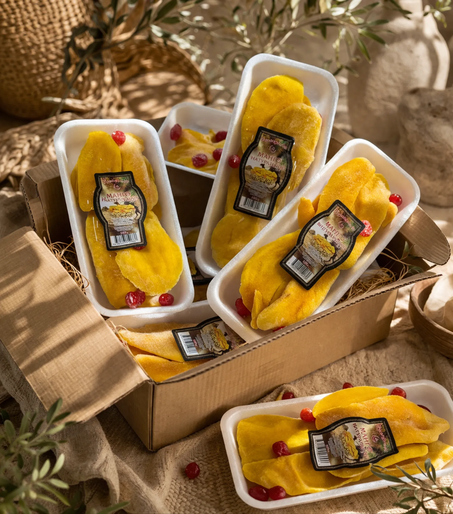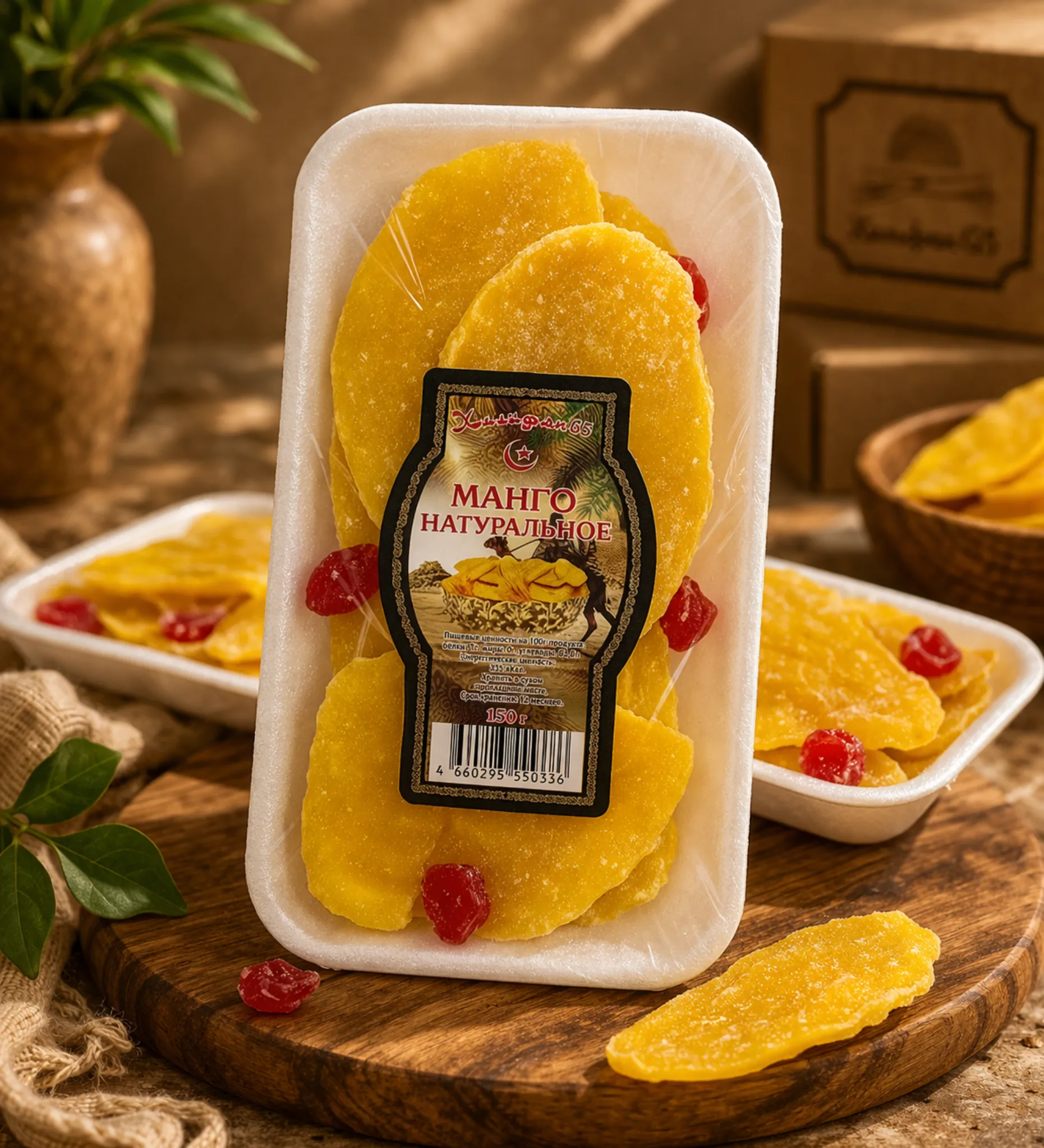 Дольки спелого манго, высушенные без добавления сахара, ароматизаторов, красителей и диоксида серы, с сохранением естественного вкуса и аромата тропического фрукта. Ломтики имеют натуральный желто-оранжевый цвет, плотную, но мягкую текстуру и яркий сладко-кислый вкус.